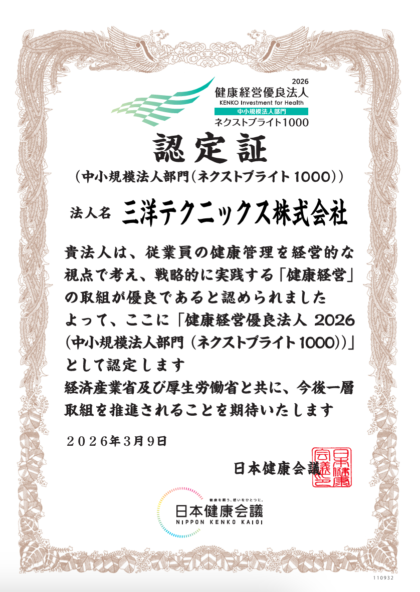 このたび弊社は、経済産業省が認定している「健康経営優良法人認定制度」より、「中小規模法人部門」23,085法人の中で上位500法人の「ブライト500」次ぐ、501から1500法人の「ネクストブライト1000」に認定されました。